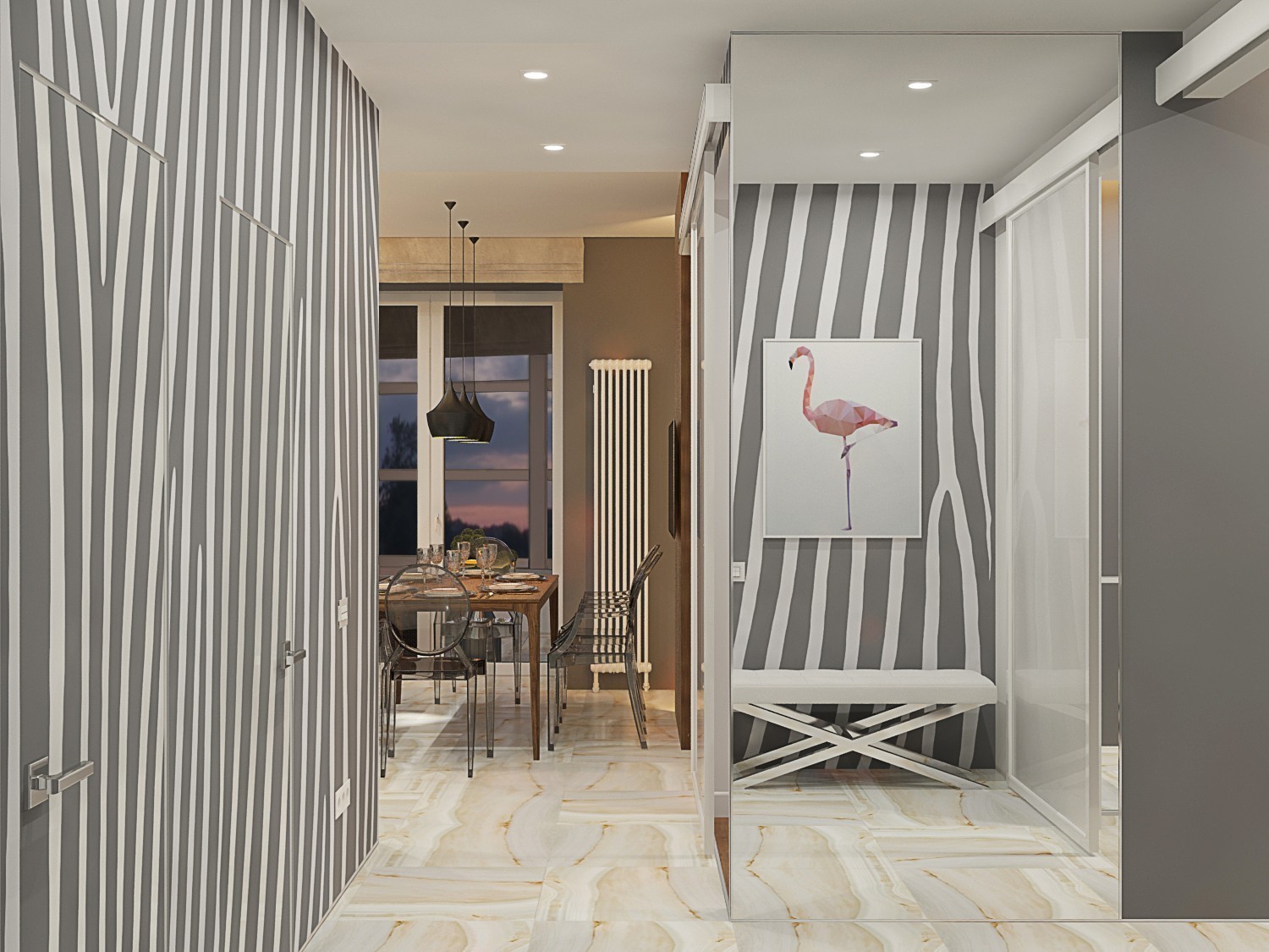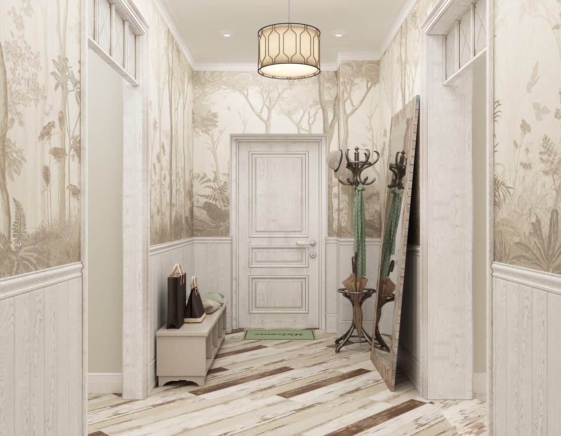 Souvent, le couloir comporte de nombreuses portes qui mènent à d’autres pièces de la maison.Cela suggère que le papier peint devrait aller avec.