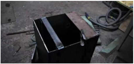 - Soudez le panneau arrière en l'insérant entre les parois latérales. Des marquages sont effectués pour déterminer l'emplacement du cendrier, du foyer et de la grille. Ces derniers sont installés à une hauteur de 10-15 cm, pour lesquels les coins sont préalablement soudés afin que l'étagère « regarde » vers le bas.