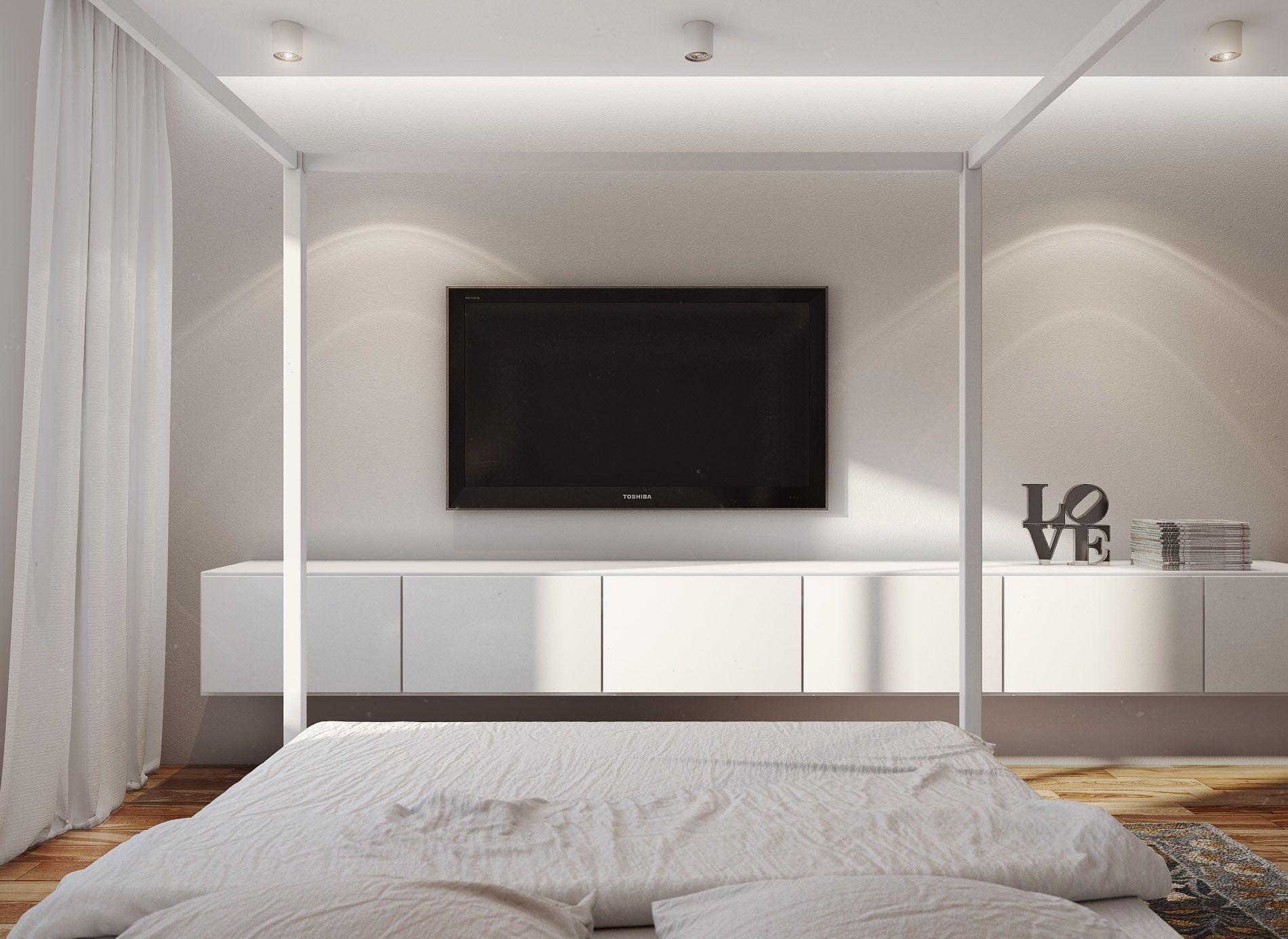 Le lit ne doit pas avoir un design classique. L’arbre n’étant pas le bienvenu, il faut le camoufler avec un bâche. Les lits sur podium avec une bande LED le long sont très populaires. Visuellement, il semble flotter. Les auvents et les têtes de lit souples sont extrêmement inappropriés.