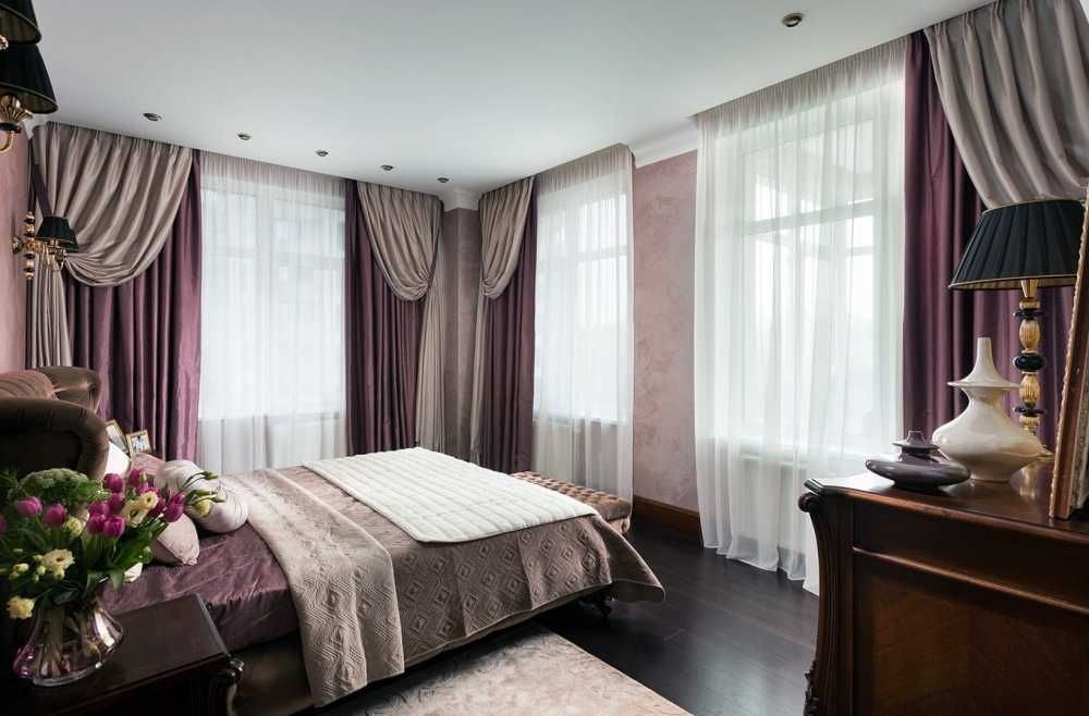 Les rideaux lumineux contribueront à créer du confort dans un intérieur traditionnel. Il est permis d'utiliser plusieurs couches. Les rideaux doivent être fabriqués dans un matériau dense, car pour un bon sommeil, vous devez bloquer autant que possible l'accès à la lumière.Lors du choix d’autres tissus textiles, il est important de prêter attention à la couleur et au design. Vous devez limiter la présence de motifs clairs et privilégier les tons calmes.