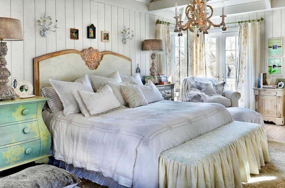 Le lit est considéré comme la pièce centrale de toute chambre. Pour le vintage, choisissez un modèle avec des pieds forgés ou une structure en métal pouvant être peinte en blanc comme neige. Les couvre-lits de couleur crème sont également idéaux.